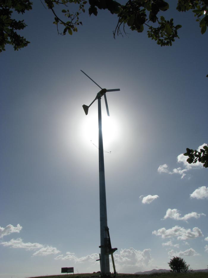 2018 Update: Our turbine was damaged by Hurricane Maria (even though it had been lowered). A decision was made to give it to another non-profit on island who could afford to repair it, and use an RCA grant to install solar panels instead (which is now feasible due to lower panel prices and our lower electrical consumption because the school we once housed closed during the recession).